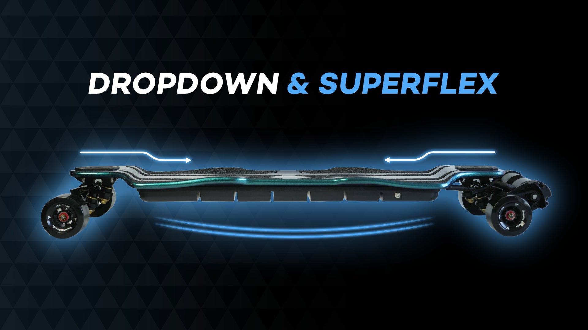 The deck is built with 9 layers of Canadian maple reinforced with fiberglass. This combination gives the board exceptional flexibility and durability. Even with the installation of small longboard wheels, the deck effectively absorbs road irregularities.The deck features a dropdown, which lowers the rider's center of gravity, making the rider feel literally glued to the road they're moving on. The dropdown allows you to secure your foot at the widest point of the deck, providing greater stability and traction under your foot during aggressive rides enabled by the electric skateboard.